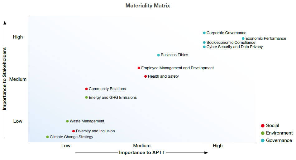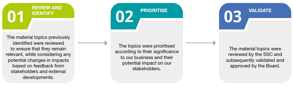 We have taken a three-step approach to review and identify, rate and prioritise, and validate the material ESG factors that are significant to our business operations and are of significant interest to our key stakeholders. The materiality assessment process was conducted by the senior management of both the Trustee-Manager and TBC under the guidance of an external consultant. In 2024, we conducted a materiality refresh of our existing topics to ensure alignment with industry standards and stakeholder expectations. As there have been no significant changes to the business landscape, our material topics remain unchanged. The SSC oversaw the materiality assessment review process and outcome, where the topics were mapped onto a materiality matrix. APTT will continue to carry out comprehensive materiality assessments annually to identify and prioritise the most critical sustainability issues for our business. Moving forward, we will continue to assess the list of material ESG factors annually to ensure our sustainability initiatives and policies remain aligned with both our business objectives and stakeholder expectations.